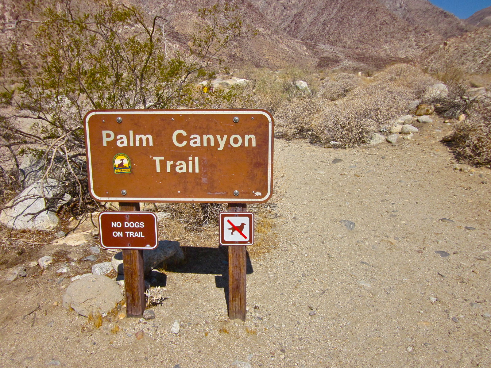 The trail starts off right from the Borrego Palm Campground, which is really easy to find. Enter the campground, make sure to pay at the self paying station, and proceed into the campground. Try to keep to your right, and you really should see a sign for borrego palm canyon trail. The parking is wide and there’s a restroom and a water fountain at the trail head. This is pretty moderate hike and could be considered easy for some. It has very little elevation gain, but it also requires a little bit of squeezing through boulders and big steps over rocks.
