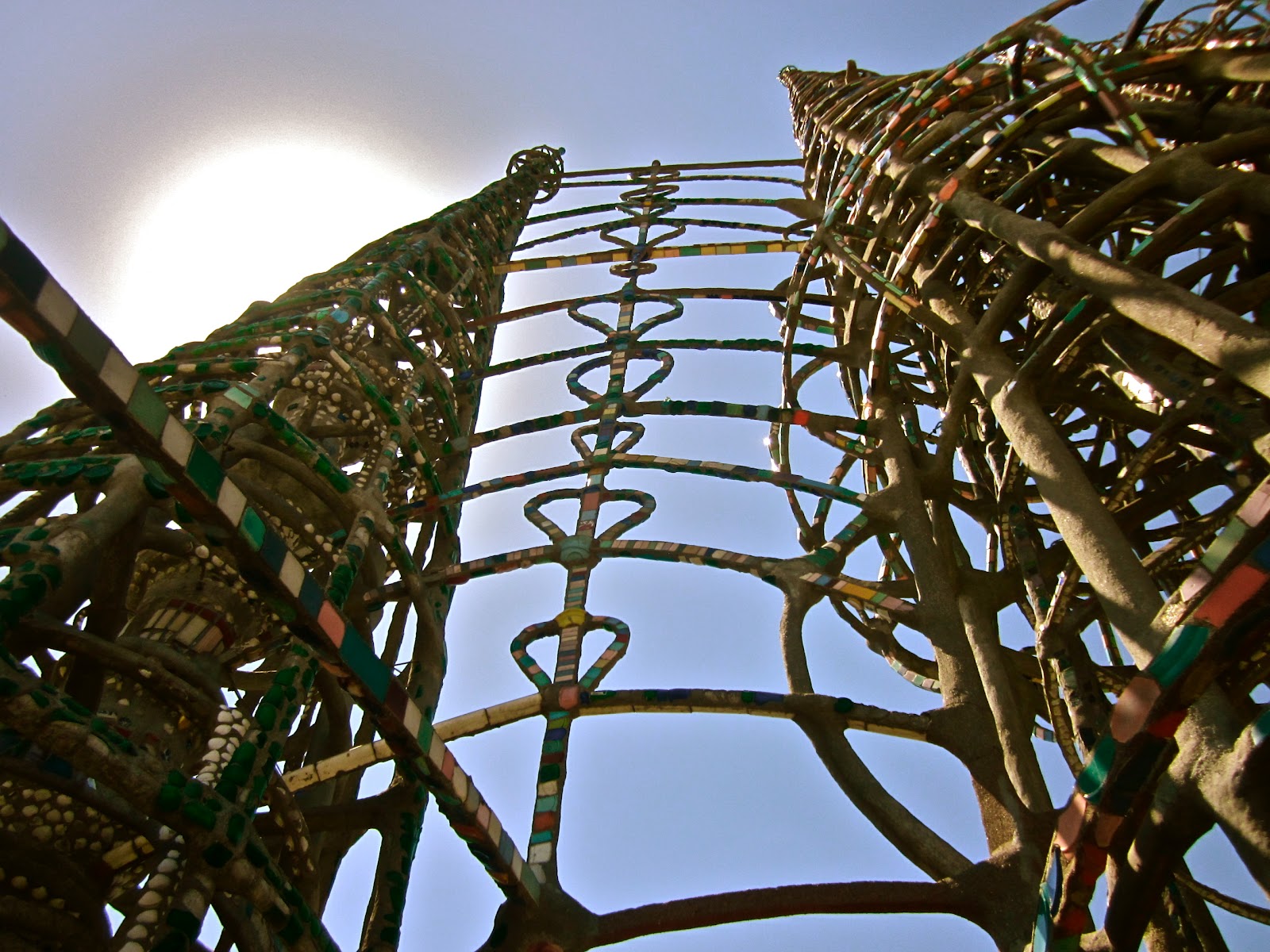 After collecting and purchasing broken glasses, plates, and 7 Up bottles from his neighborhood, he successfully finished this these towers in 30 years ALL BY HIMSELF without prior architecture knowledge. The towers were made of metal and decorated with whatever he was able to gather. When he finished, people in his neighborhood were able to admire the towers and see their pieces of contribution. The ground was designed to resemble a shape of a ship that would one day take him home to Italy.