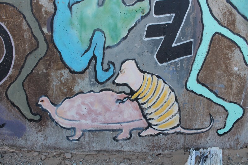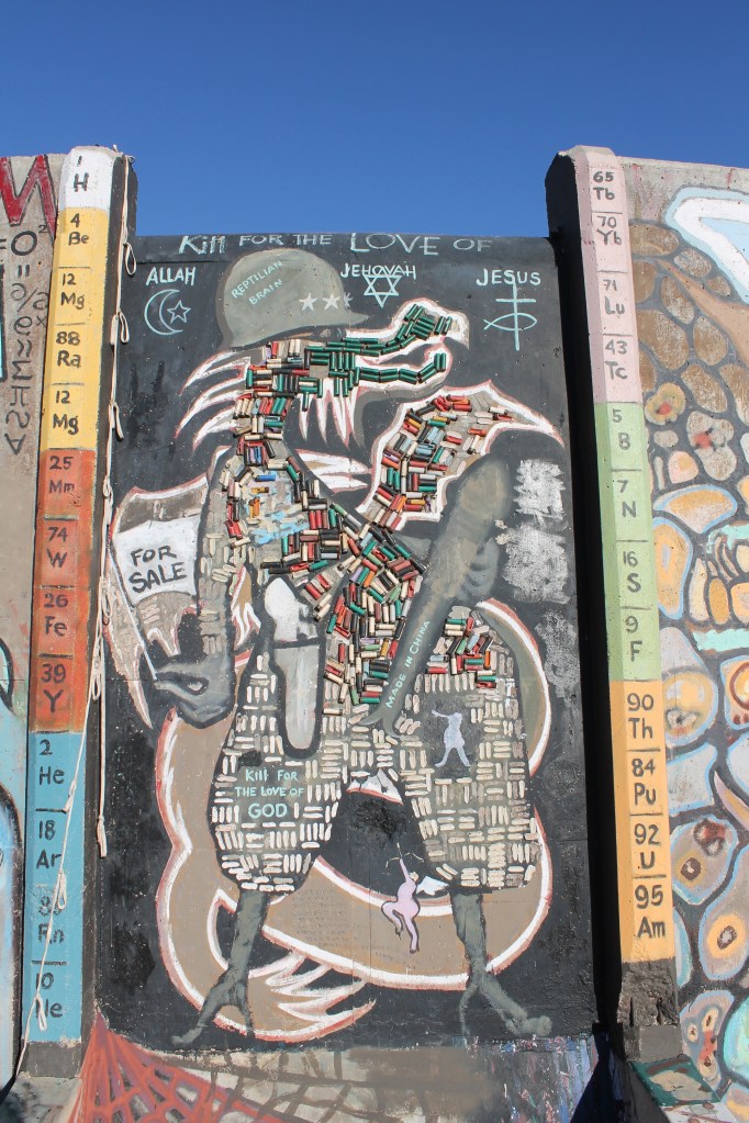 I am not sure why these painting are here, but at Slab City, artists from all over have come here to express their creativity which create many of these amazing unusual art projects in the desert. For example, East Jesus which is also less than a mile away from Salvation Mountain, is a garden filled with post apocalyptic art projects done by multiple artists out of trash and used items that people have been dumping in this desert for years.